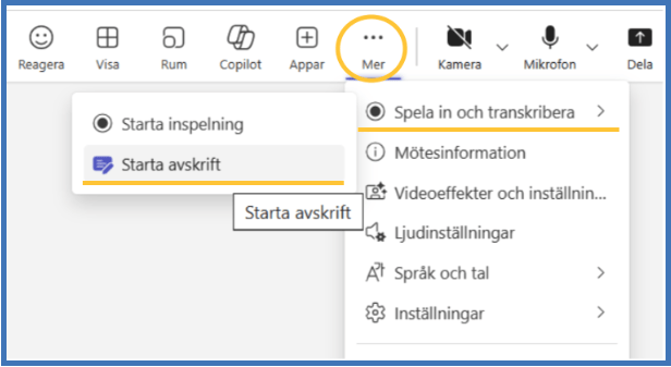 • Klicka på ”Mer” (···) i Teams när mötet börjat.